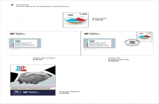 设计理念:邮票上的两座山峰分别代表着位于阿根廷境内的南美洲最高峰——阿空加瓜峰和位于中华人民共和国与尼泊尔边界上的世界最高峰——珠穆朗玛峰。阿空加瓜峰的蓝色象征着阿根廷,珠穆朗玛峰的红色象征着中国。两座山峰紧密连接在一起,就像两国人民的友谊一样坚若磐石。邮戳印有中西文“阿根廷—中国建立外交关系五十周年”字样,两国国旗位于正中,数字“50”代表着两国建交半个世纪以来的历程。除邮票和首日封外,阿根廷国家邮局还特别推出了纪念册,完整记录了建交以来双边政治、经济、文化等各方面关系的发展。