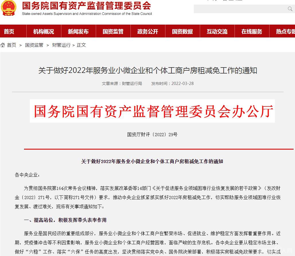 国资委办公厅3月28日发布通知对此进行落实,要求普遍减免3个月租金工作要力争在上半年实际完成主体工作,补充减免3个月租金工作要在列为中高风险地区后2个月内完成。