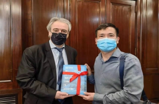阿根廷莫雷诺华商会庄将德会长代表旅阿华侨华人赠送一本《阿根廷华人移民史》书籍给国务副秘书长安东尼奥‧阿尔曼多‧梅斯梅西安。