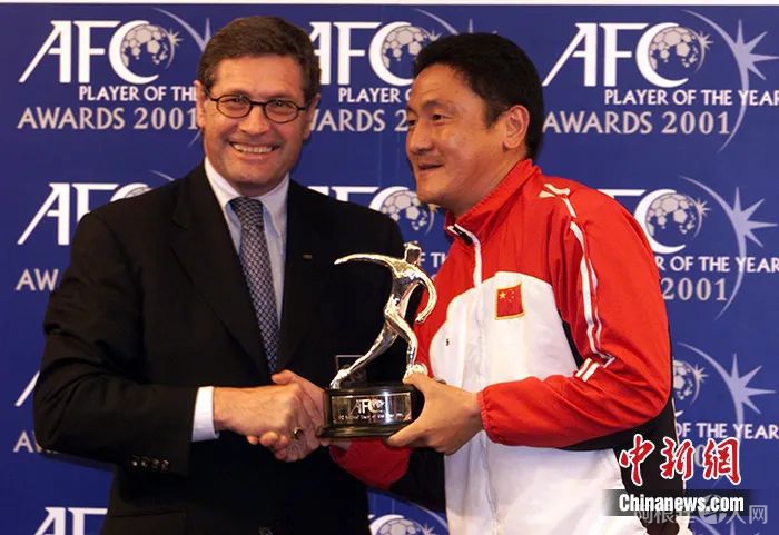 资料图:亚足联2001年度最佳奖项颁奖大会,国际足联技术部主任盖特为马明宇颁发亚洲最佳国家队奖。