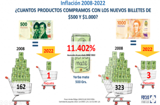 (阿根廷华人网5月31日讯 黄东)在阿根廷正经历高通胀的背景下,“聚焦市场”(Focus Market)咨询公司发布了一份报告,就国内最大面值的两种纸币500比索和1000比索在2008年和当下的购买力做了对比。