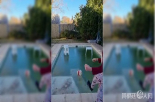 在视频中,为证明游泳池已结冰,该户人家将一张桌子和凳子置在上面,且在上面踢球。