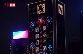 6月20日晚8时,中新社记者在维多利亚港两岸看到,灯光音乐汇演“幻彩咏香江”准时登场。维多利亚港两岸的摩天大楼随着音乐变换呈现不同的互动灯光效果,呈现出维多利亚港充满动感和多姿多彩的一面。部分大楼外墙以彩色灯饰显示“庆祝香港回归祖国25周年”的字样。