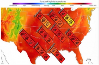 美国家气象局表示,这股热浪将向东移动到墨西哥湾沿岸和中西部地区,并扩散到五大湖和卡罗莱纳州东部。气象预报公司AccuWeather警告,随着气流北上,美国更多地区将“剧烈升温”。