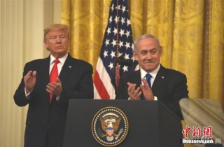 资料图:2020年1月28日,美国前总统特朗普和以色列前总理内塔尼亚胡在白宫举行联合发布会,宣布所谓推动解决巴勒斯坦与以色列问题的“世纪协议”。巴勒斯坦方面此前已表示,该协议违反国际法,呼吁国际社会予以拒绝。 中新社记者 陈孟统 摄