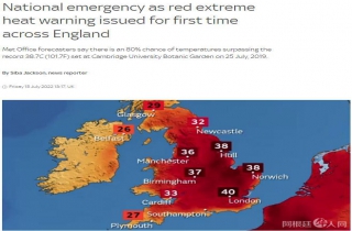 “绝对史无前例”,英国气象局局长彭妮·恩德斯比对英国发布史上首个极端高温红色预警评价道。