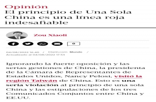 8月4日,驻阿根廷大使邹肖力在阿根廷第一大报《号角报》发表题为《一个中国原则是不可逾越的红线和底线》的署名文章,详细阐释台湾问题的历史经纬和一个中国原则的法理依据,强烈谴责美国众议长佩洛西窜访台湾地区、公然进行政治挑衅的恶劣行径,揭批美挑起台海危机,成为和平的最大破坏者,重申中国政府和人民坚决挫败外部干涉和“台独”分裂势力图谋,维护一个中国原则并最终实现祖国统一的坚定决心、坚强意志和强大能力。全文如下: