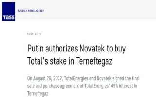 8月26日,道达尔正式宣布,已与诺瓦泰克签署Terneftegaz49%的权益转让。这意味着,该公司100%权益归属俄方。