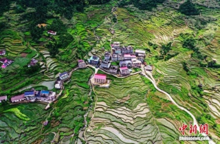 资料图:航拍位于江西省上饶市广信区望仙乡的葛路梯田,依山而下的梯田及错落有致的民居相互衬托,呈现出一幅夏日田园美景。 刘占昆 摄