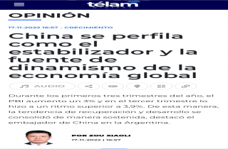 2022年11月17日,阿根廷国家通讯社刊发邹肖力大使题为《中国经济恢复持续向好发展》的署名文章。邹大使在文中指出,尽管面对复杂严峻的国内外形势和多重超预期因素冲击,今年第三季度中国国民经济仍持续恢复,总体运行在合理区间,突出表现在经济增速企稳回升、民生保障有力有效、高质量发展稳步推进、恢复发展后劲增强等方面。中国共产党二十大报告强调,发展是党执政兴国的第一要务。中方愿与包括阿根廷在内的各国共享中国大市场机遇,推动货物贸易优化升级,创新服务贸易发展机制,扩大优质产品进口,高质量共建“一带一路”,沿着合作共赢、共同发展的道路继续前进。全文如下: