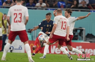 当地时间11月26日,世界杯小组赛D组次轮上演焦点大战,卫冕冠军法国队战胜丹麦队,提前一轮小组出线。本场比赛,凭借姆巴佩下半场梅开二度,法国队2:1击败丹麦队。法国队也是本届世界杯第一支确定从小组中出线的球队。图为法国球员姆巴佩(蓝)在比赛中。中新社记者 崔楠 摄