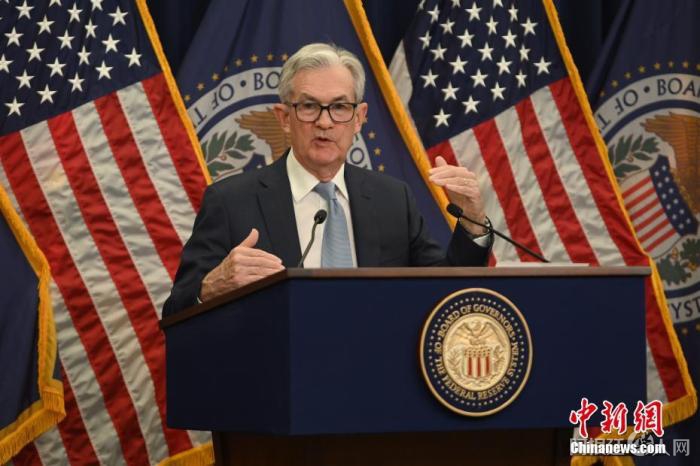 图为美联储主席鲍威尔当天在货币政策例会后出席记者会。 中新社记者 陈孟统 摄