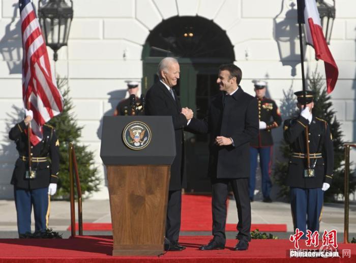 图为2022年12月,拜登在白宫欢迎来访的法国总统马克龙。 中新社记者 陈孟统 摄