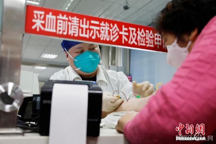 12月26日晚,上海市同济医院急诊室医护人员对患者进行救治。图为医护人员为患者抽血化验。 殷立勤 摄