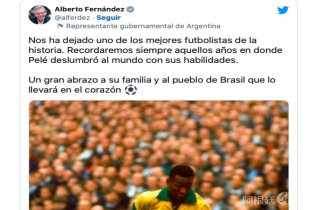 (阿根廷华人网12月29日讯 黄东)当地时间本周四,阿根廷总统费尔南德斯对球王贝利的离世表达哀悼,并评价其为“历史上最优秀的足球运动员之一”,同时向其家人及巴西人民致以问候。
