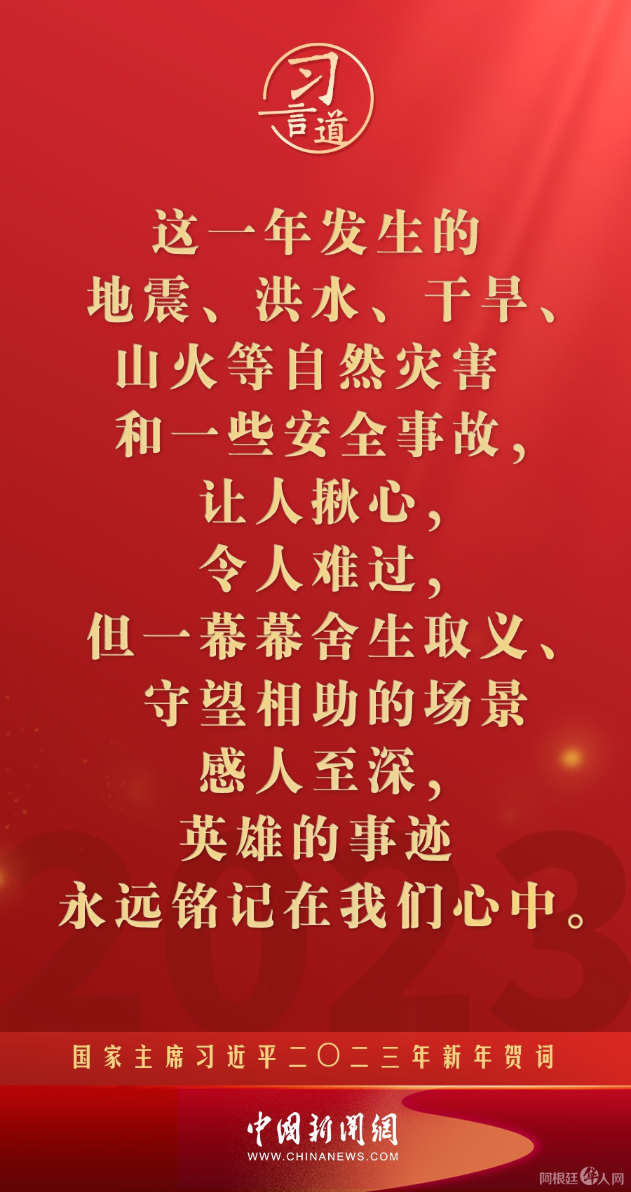 习言道|再加把劲!习近平“新年金句”暖心提气 中国新闻网 • 2023-01-02 04:43• 收藏本文 新年前夕,国家主席习近平通过中央广播电视总台和互联网,发表了二〇二三年新年贺词。他指出—— 转载本网稿件,原则上需要书面授权,不得篡改稿件主题。本网随时有权要求第三方停止侵权行为。 本网所载内容或图片,若涉及侵权,请联系删除。 02 ___________ 2023/01 习言道|再加把劲!习近平“新年金句”暖心提气 新年前夕,国家主席习近平通过中央广播电视总台和互联网,发表了二〇二三年新年贺词。他指出—— [ 微信长按识别二维码或扫码查看分享内容 ]