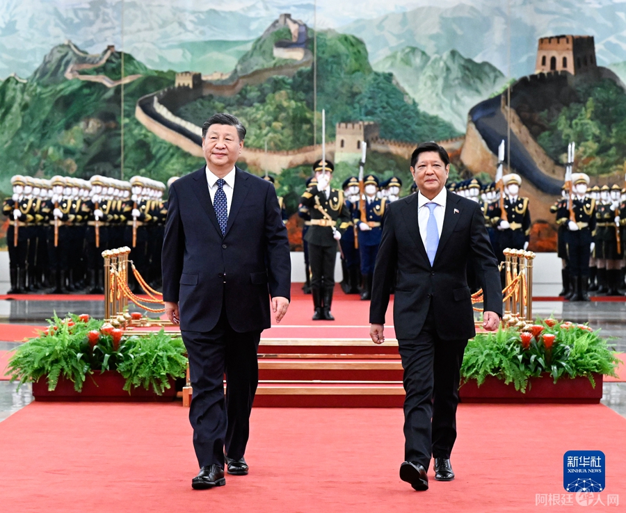 1月4日,国家主席习近平在北京人民大会堂同来华进行国事访问的菲律宾总统马科斯举行会谈。这是会谈前,习近平在人民大会堂北大厅为马科斯举行欢迎仪式。新华社记者 申宏 摄