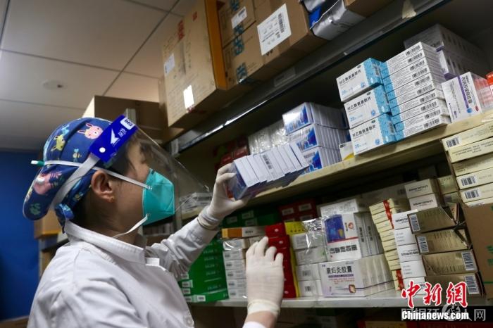 北京某社区卫生服务中心,医务人员正将配送到的感冒药放入药架。 中新社记者 易海菲 摄