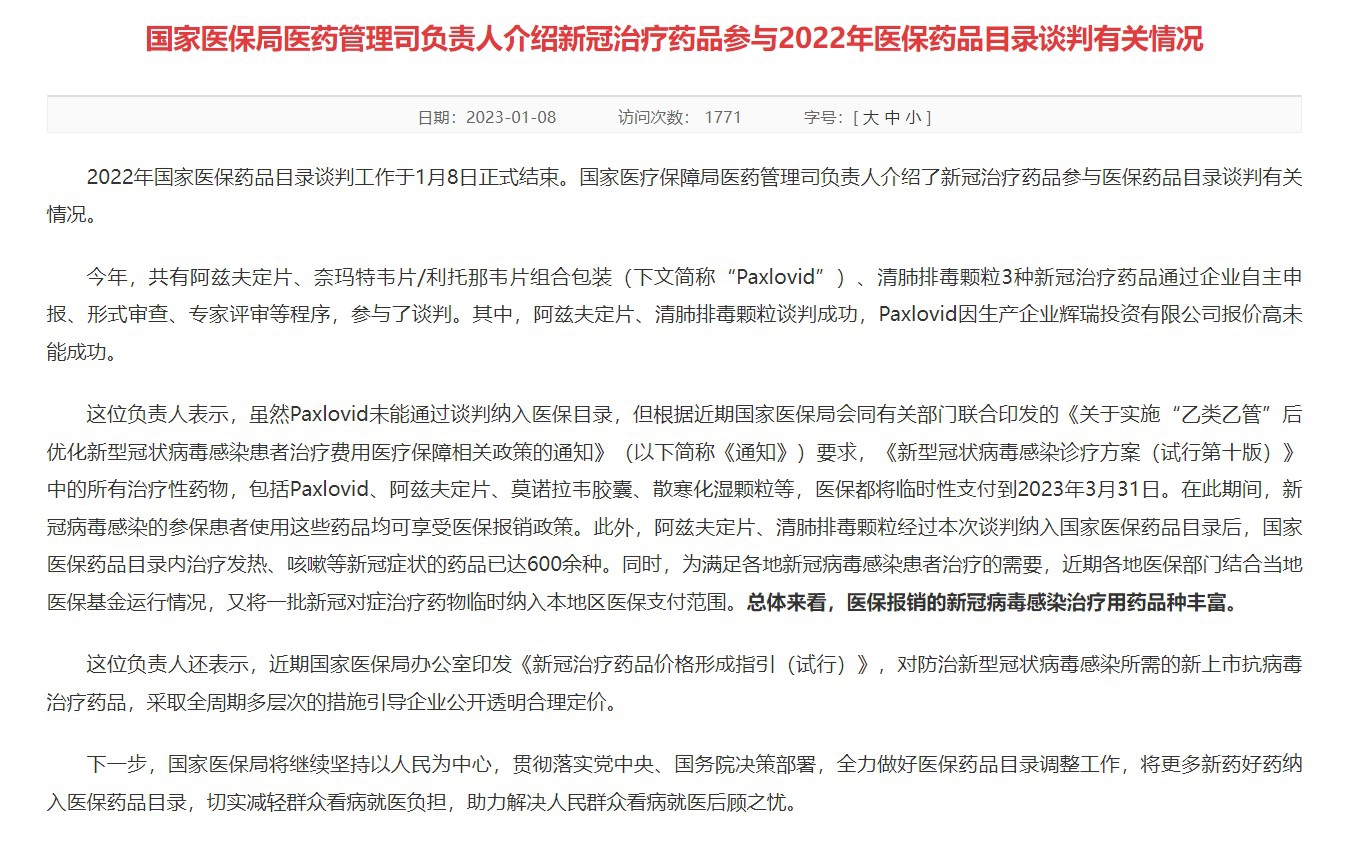 上述负责人还表示,虽然Paxlovid未能通过谈判纳入医保目录,但根据近期国家医保局会同有关部门联合印发的《关于实施“乙类乙管”后优化新型冠状病毒感染患者治疗费用医疗保障相关政策的通知》,《新型冠状病毒感染诊疗方案(试行第十版)》中的所有治疗性药物,包括Paxlovid、阿兹夫定片、莫诺拉韦胶囊、散寒化湿颗粒等,医保都将临时性支付到2023年3月31日。在此期间,新冠病毒感染的参保患者使用这些药品均可享受医保报销政策。