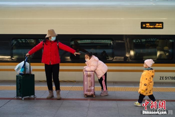 1月16日,北京西站,乘客招呼小朋友尽快登车。 中新社记者 盛佳鹏 摄