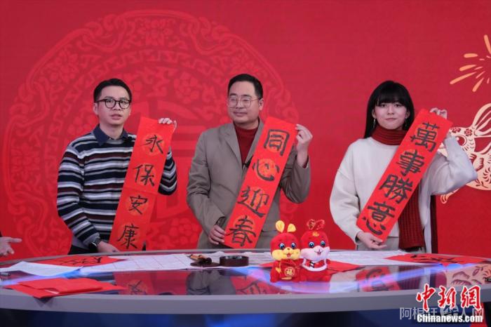 访谈现场,三位台青还上手写了“春联”,斗方上的“启、兴、拼”,以及四字的祝福“永保安康”“同心迎春”“万事胜意”代表了他们最想表达的新年希冀。