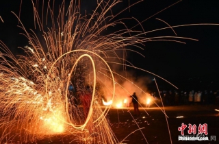 河北省石家庄市井陉县天长宋古城1月27日晚开展多项非遗展演,1月27日晚,天长宋古城的民俗艺人表演“火流星”。 翟羽佳 摄