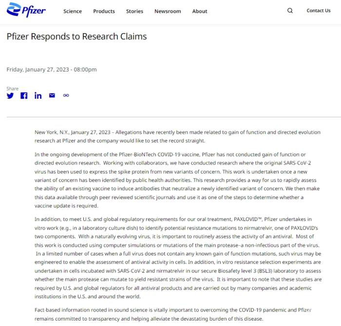 当地时间27日,辉瑞在官网紧急发声,希望澄清事实。辉瑞的声明中称,最近有指控称辉瑞公司进行功能获得和定向进化研究,该公司希望澄清事实。