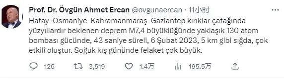 当地时间6日,土耳其地震专家艾哈迈德·奥文·埃尔詹社交媒体推特截图。