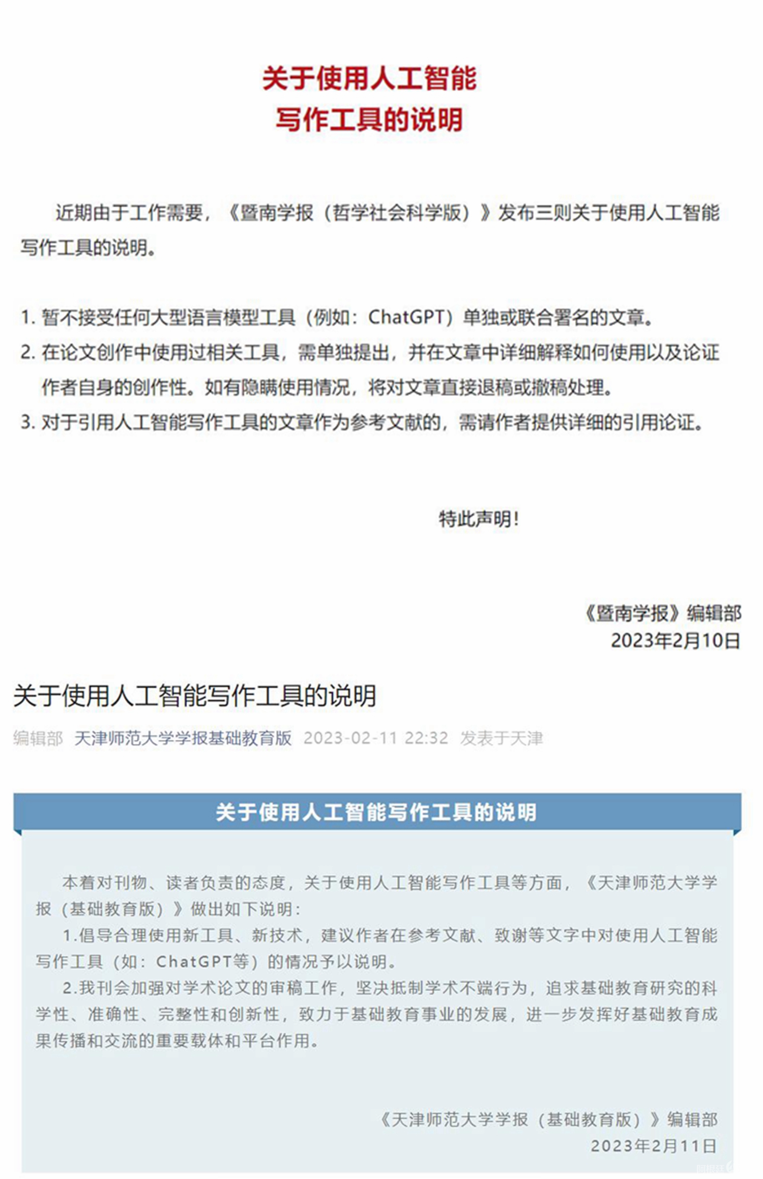 近日,《暨南学报(哲学社会科学版)》《天津师范大学学报(基础教育版)》也发布相关声明,提出暂不接受任何大型语言模型工具(例如:ChatGPT)单独或联合署名的文章,或建议对使用人工智能写作工具的情况予以说明。