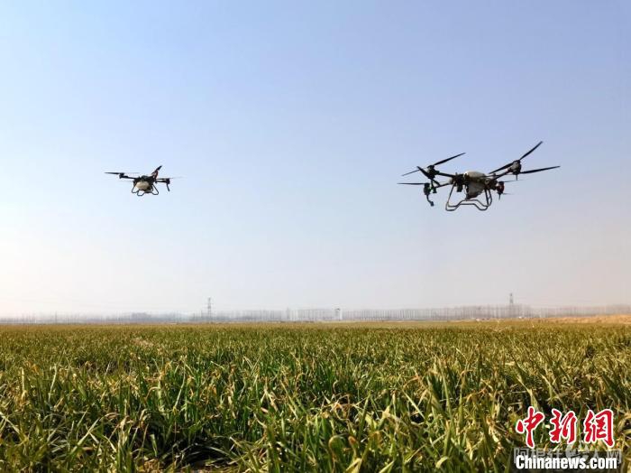 在山东省嘉祥县纸坊镇黄村的高标准农田里,无人机和植保机在田间穿梭。赵九龙 摄
