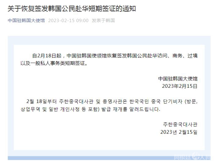 中新网2月15日电 据中国驻韩国大使馆微信公众号消息,自2月18日起,中国驻韩国使领馆恢复签发韩国公民赴华访问、商务、过境以及一般私人事务类短期签证。图片来源:中国驻韩国大...