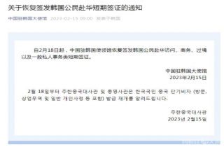 中国驻韩国大使馆:2月18日起恢复签发韩国公民赴华短