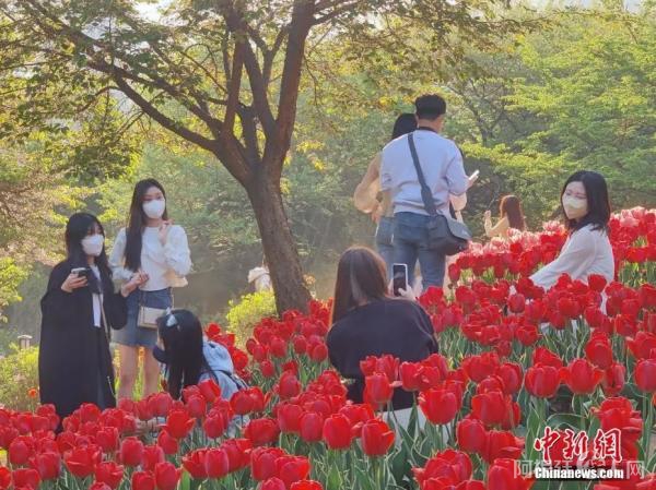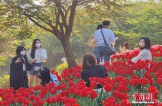 资料图:首尔民众在西大门区弘济川郁金香园赏花。中新社记者 刘旭 摄