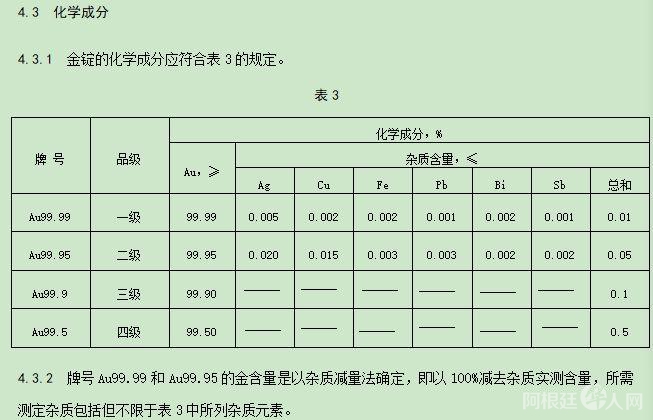 当前,在对金锭杂质标准的界定上,不同国家的规定有所不同。