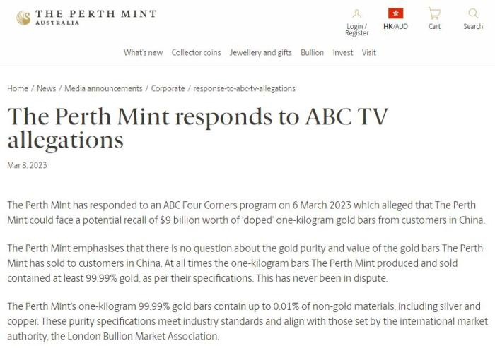 而对于澳大利亚广播公司的报道,珀斯铸币厂也做出了回应。该铸币厂强调,出售给中国客户的金条的黄金纯度和价值没有任何问题。
