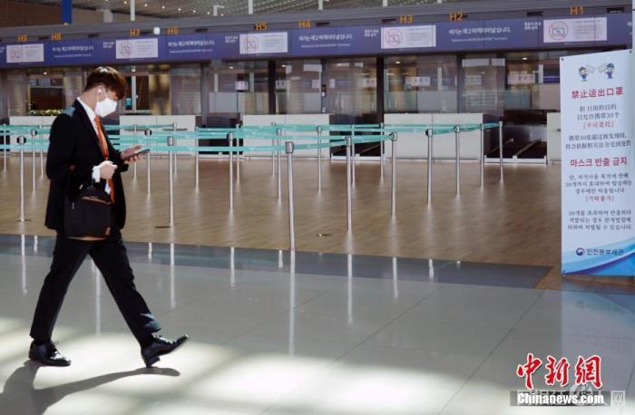 资料图:韩国仁川国际机场,工作人员走过机场大厅。中新社记者 曾鼐 摄