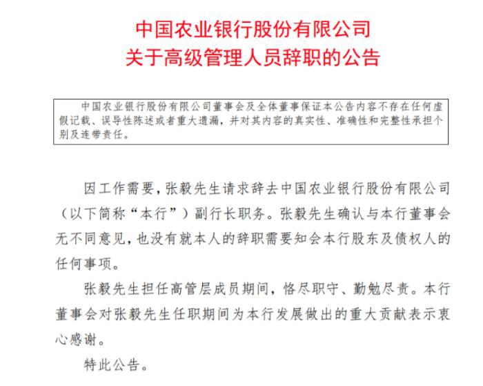 中国农业银行也人事变动不断。21日,农行公告称,因工作需要,张毅请求辞去中国农业银行副行长职务。