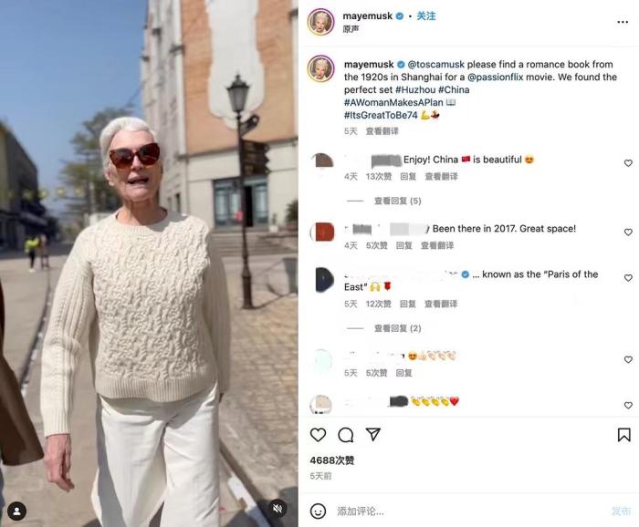梅耶·马斯克游览湖州影视城。(图片来源:梅耶社交媒体截图)