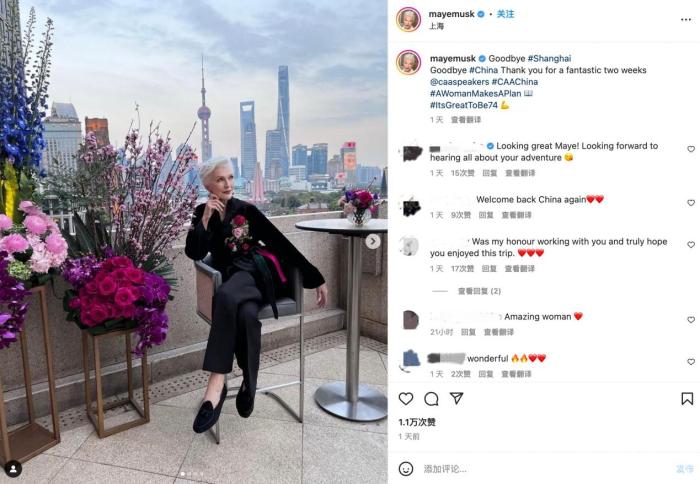 梅耶·马斯克在上海游览。(图片来源:梅耶社交媒体截图)
