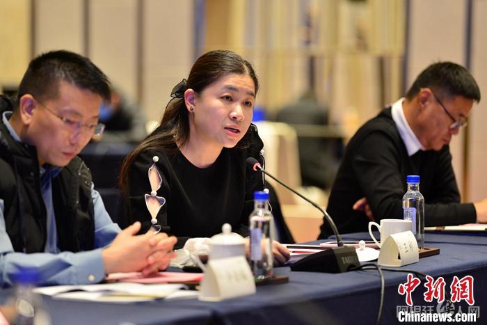 图为4月6日,福建福州,日本福建经济文化交流促进会理事、日本东京株式会社大华物产社长王彬(中)在海外侨商联谊发展座谈交流活动上发言。 中新社记者 张斌 摄