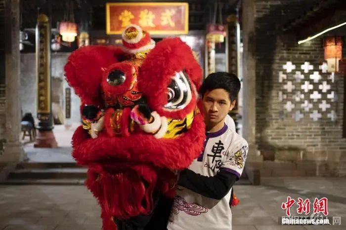 图为2022年1月18日晚,广州市天河区车陂龙狮体育会舞狮队队员王智铭在晴川苏公祠拿着一头红狮。王智铭是一名“00后”,学习舞狮已3年,他说自己的目标是“世界狮王”。 中新社记者 陈楚红 摄