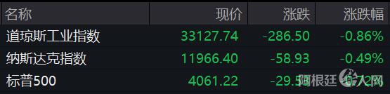 中新经纬5月5日电 美东时间周四,美股三大指数低开低走。道指收跌286.50点,跌幅为0.86%,报33127.74点;纳指收跌58.93点,跌幅为0.49%,报11966.40点;标普500指数收跌29.53点,跌幅为0.72%,报4061.22点。