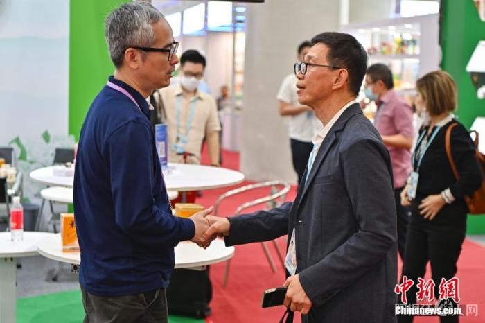 5月2日,广东省广州市,印尼百年老店“章长盛”的第四代传人章镇强(右)在广交会上与一名茶叶产品参展商握手。 中新社记者 陈骥旻 摄