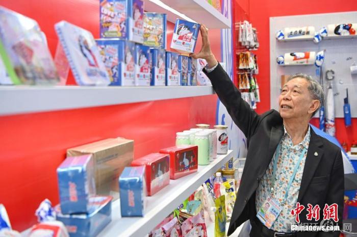 图为5月1日,广东省广州市,来自加拿大的采购商谢伯衡在广交会上挑选大白兔奶糖。 中新社记者 陈骥旻 摄