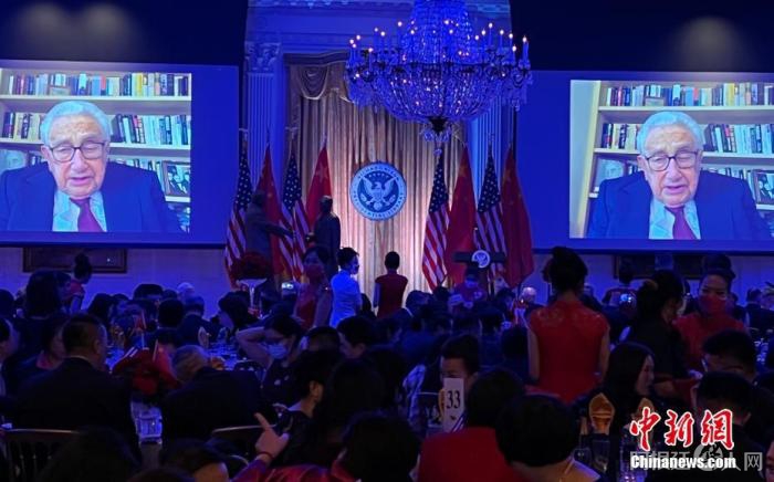 资料图:当地时间2022年2月24日晚,“破冰之旅”50周年纪念活动在美国前总统尼克松的家乡加利福尼亚州约巴林达市的尼克松图书馆隆重举行。图为美国前国务卿基辛格博士通过视频发表致辞。 中新社记者 张朔 摄