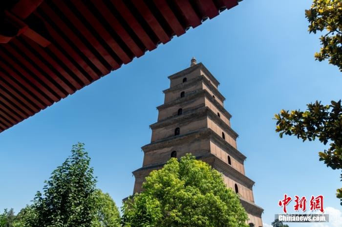资料图:1300余岁的西安大雁塔在蓝天白云的映衬下,展示着别样的壮观美丽,吸引着来自天南海北的游人。图/CNSphoto 王冈