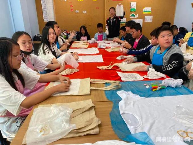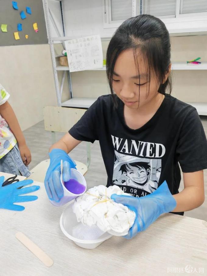 随后同学们以小组为单位对扎染的纹样设计和制作方式进行了讨论,并运用捆扎法和夹扎法等扎染纹样制作技巧进行了实践探索,在帆布包、T恤、丝巾上染制出一个个色彩丰富、图案生动、别具一格的扎染作品。