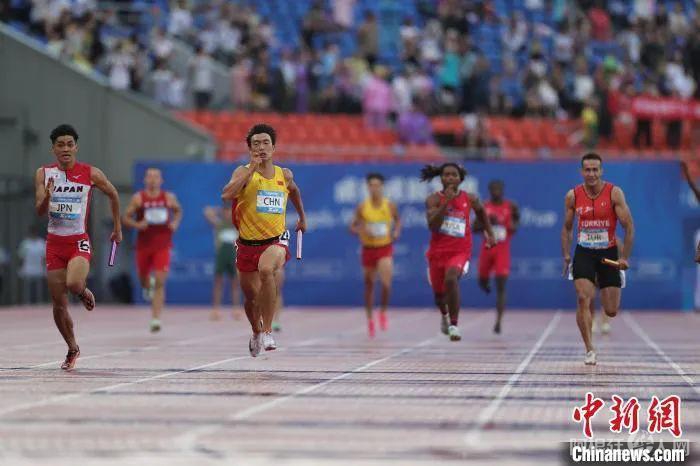 中国队邓智舰在男子4×100米接力决赛最后一棒冲刺中。蒋启明 摄