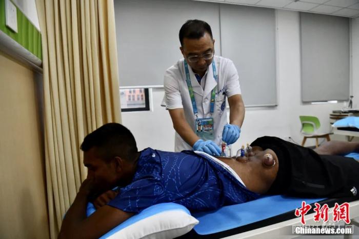 7月31日,斯里兰卡跳高运动员达森在大运村医疗中心康复医学科接受中医拔罐诊疗。 张浪 摄