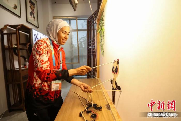 8月2日,土耳其田径运动员SUBATAN Burcu在体验皮影戏。瞿宏伦 摄
